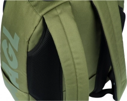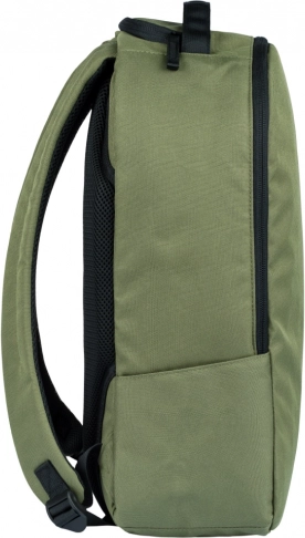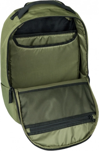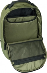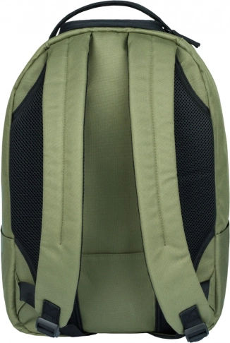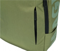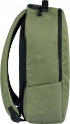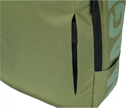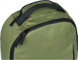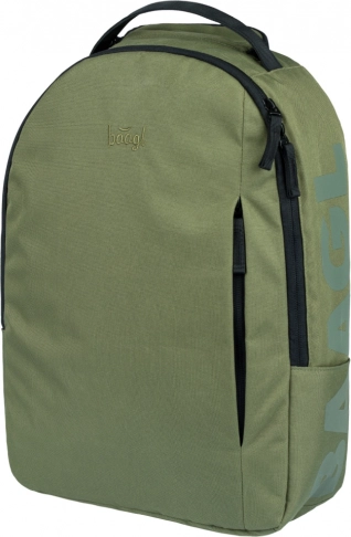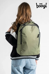 Stijlvolle stadsrugzak BAAGL eARTh in khaki, gemaakt van 100% gerecycled, waterafstotend materiaal. Biedt ergonomisch gevormde rug, verstelbare schouderbanden, een gepolsterd vak voor een 15"-laptop en praktische voor- en bovenvakken met rits. Met een laag gewicht van 500 g, inhoud van 18 l en een draagvermogen tot 7 kg is hij ideaal voor school, stad en werk.
