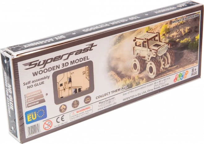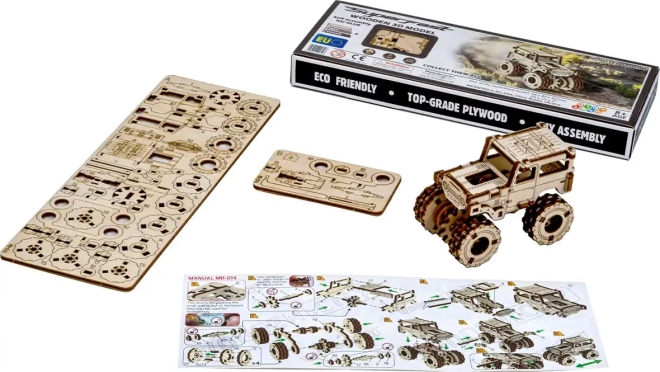 Houten 3D-puzzel monstertruck geïnspireerd op TOYOTA FJ40. 64 onderdelen, eenvoudige montage in 30 min, zonder lijm, van berkenmultiplex. Geschikt vanaf 8 jaar.