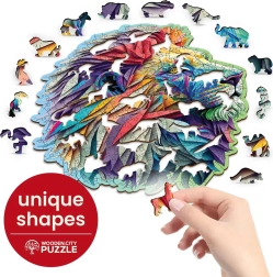 Trakteer jezelf op een originele puzzelervaring met de houten puzzel Moderne leeuw van WOODEN CITY. Speciaal gevormde stukjes, waarvan een deel de vorm van dieren heeft, creëren bij het leggen een indrukwekkend motief met geaccentueerde laserdetails. Sommige stukjes kunnen op zichzelf staan als kleine figuurtjes.
