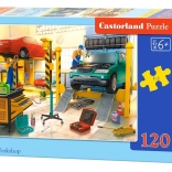 Kleurrijke puzzel voor kinderen met het thema autowerkplaats, bevat 120 stukjes – ideaal voor plezier en ontwikkeling van de kleintjes. Na het leggen ontstaat een afbeelding van 32 x 23 cm.