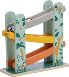 We presenteren u een geweldige houten racebaan met drie autootjes! Geniet van de kleurrijke variatie van de baan en kijk hoe uw kinderen met enthousiasme de autootjes van de ene verdieping naar de andere zien tuimelen. Het is aangekleed met prachtige motiefillustraties van dieren die het een speelse draai geven. De autootjes hebben rubberen banden voor stabiel rijden en ontwerp aan beide zijden.