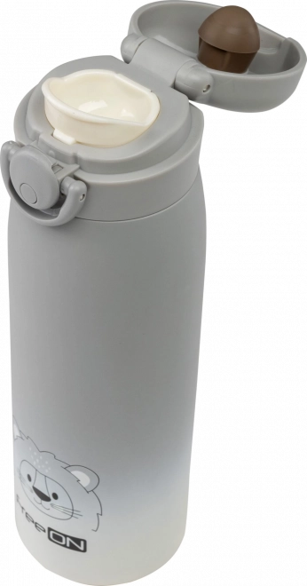 De buitenkant van de thermosfles is versierd met een aantrekkelijk leeuw motief dat kinderen aanspreekt en de fles een originele uitstraling geeft.