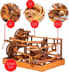 Kernfuncties omvatten scherpe bochten, spiraalvormige afdalingen en hefboomliften. Zonder lijm of gereedschap te gebruiken, geniet je van een puzzel die een ingenieur waardig is. Bij het bouwen leer je over tandwielen, elastiekmotoren en tandwielen.