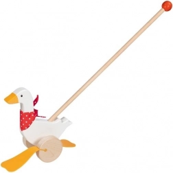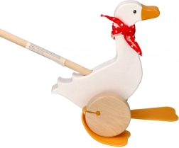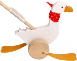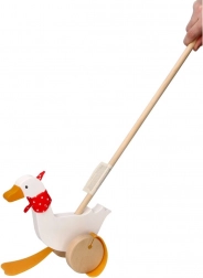 De kindergans Berta, gemaakt van kwaliteits hout, charmeert met haar klassieke design: een rood gestippeld sjaaltje en opvallende “zwem”-pootjes die schattig bewegen tijdens het duwen. De lange stok maakt het sturen gemakkelijk en stimuleert actieve beweging bij kinderen.