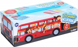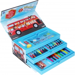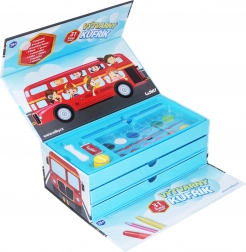 Alles wat jonge kunstenaars nodig hebben in één praktische koffer met busmotief: 31 stuks knutsel- en tekenspullen – kleurpotloden, wasco's, viltstiften, waterverf, gum, puntenslijper, potlood, penseel, sponsje en notitieboekje. Ideaal voor onderweg en thuis en een geweldig cadeau voor creatieve kinderen.