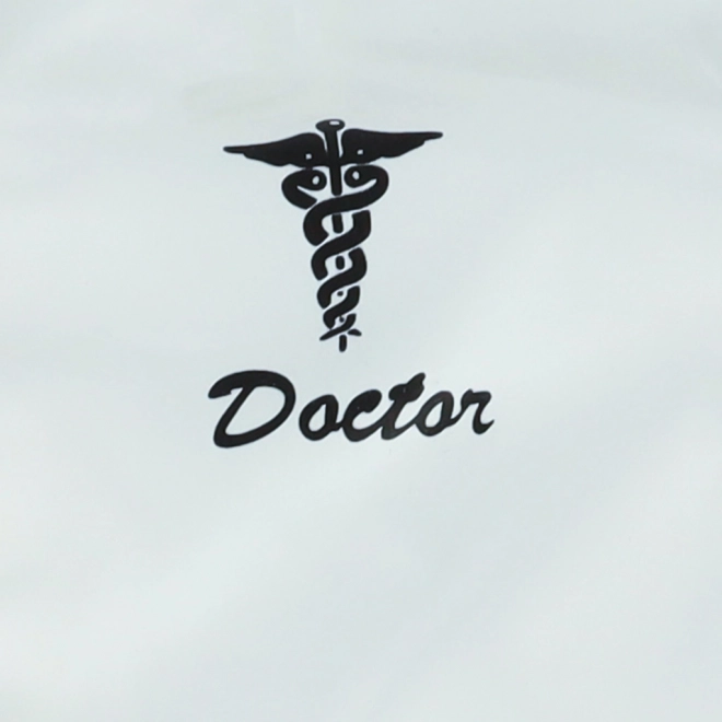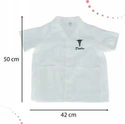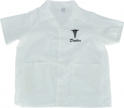Witte doktersjas met korte mouwen, twee zakken en een caduceus symbool met de tekst 'Doctor'.