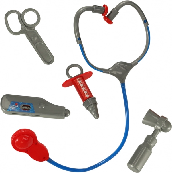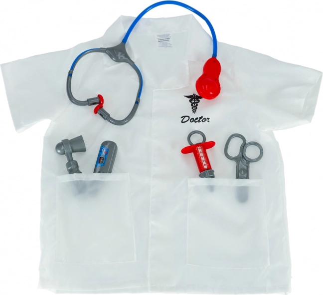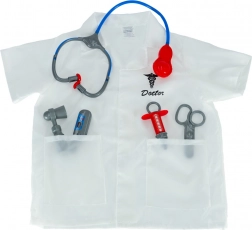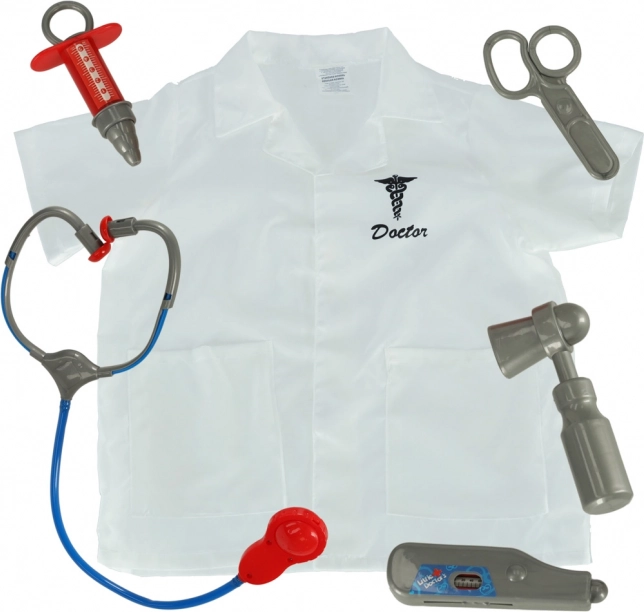 Bevat een doktersjas en medische instrumenten: stethoscoop, schaar, injectiespuit, thermometer en reflexhamer.