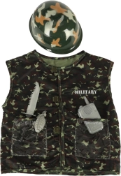 Met dit militaire kostuum voelt uw kind zich als een echte soldaat. Het kostuum bestaat uit een camouflagevest en een militaire helm en is ontworpen om zelfs de wildste spellen te weerstaan.