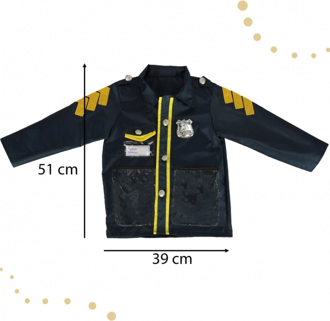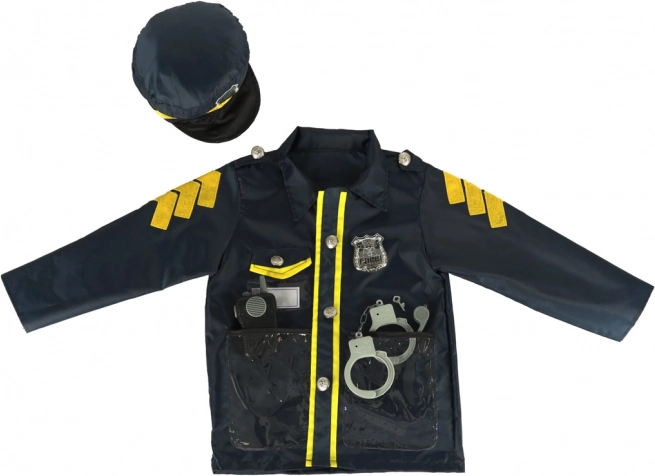Het kostuum bevat een jas en hoed met authentieke details zoals een badge en andere accessoires die een echte politie-uniform imiteren.