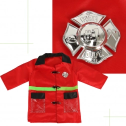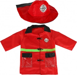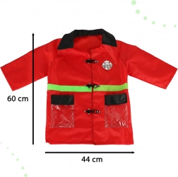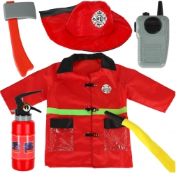 Met deze brandweerset kunnen kinderen spelen dat ze mensen en eigendommen redden. Het kostuum bevat een rode jas met reflecterende elementen, een brandweerhoed, een walkietalkie, een brandblusser, een hakbijl en andere accessoires.