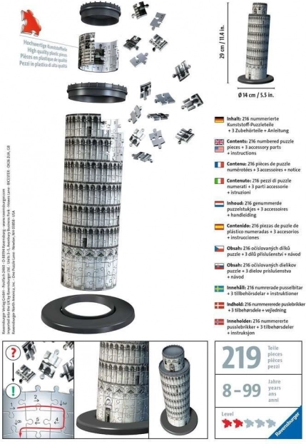 Ravensburger brengt opnieuw innovatie in de wereld van puzzels met het 3D model van de beroemde Scheve Toren van Pisa. Dit model bevat speciale stukjes die precies op hun plaats passen en geen lijm nodig hebben, waardoor het hele werk duurzaam en stabiel is.