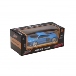 De blauwe Audi R8 Coupé is verpakt in een zwarte doos met een transparant venster, wat een gedetailleerde blik op het model mogelijk maakt.