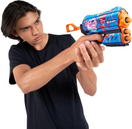 Treed in actie met de compacte X-Shot Flux Gametime blaster, gemaakt voor snelle vuurgevechten en plezier met vrienden. Dankzij de capaciteit tot 8 darts en de ergonomische vorm kun je comfortabel richten en dart na dart afvuren. Het kleurrijke game-design geeft elke strijd extra stijl.