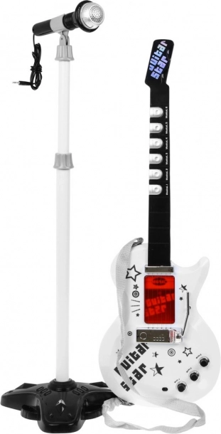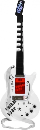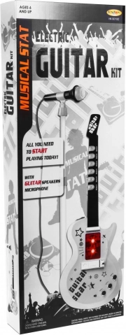 | Unieke elektrische gitaar voor toekomstige gitaristen, samen met een microfoon in de set. De gitaar is een bijzonder inspirerend snaarinstrument dat een uiterst belangrijke rol speelt in blues, country, flamenco, rockmuziek en in veel vormen van popmuziek. Een kind toont al in de eerste levensjaren interesse in het bespelen van speelgoed, danst, zingt en probeert op eenvoudige instrumenten te spelen. Aanwezigheid van muziek in de ontwikkeling van het kind heeft onmiskenbaar een positieve invloed. Talent dat in zo’n vroeg stadium wordt ontdekt, heeft een grote kans zich later sterk te ontwikkelen, dus dit moment mag niet worden gemist. Als uw kind met onvoorstelbare vreugde naar gitaristen kijkt, doet alsof het op een denkbeeldige gitaar speelt en gevoel voor ritme heeft, dan kan het talent hebben voor het bespelen van elke gitaar. Het speelgoed is uitgerust met 6 metalen snaren, 3 gitaartonen, 7 melodieën en 12 korte solo’s. | Setinhoud | - gitaar met verstelbare schouderband (werkt op 3 AA-batterijen 3 x 1,5 V – niet inbegrepen), - microfoon voor stemversterking, - verstelbaar statief (2 niveaus), - instelling van het microfoonniveau, - MP3-kabel, |