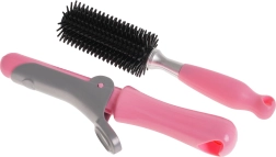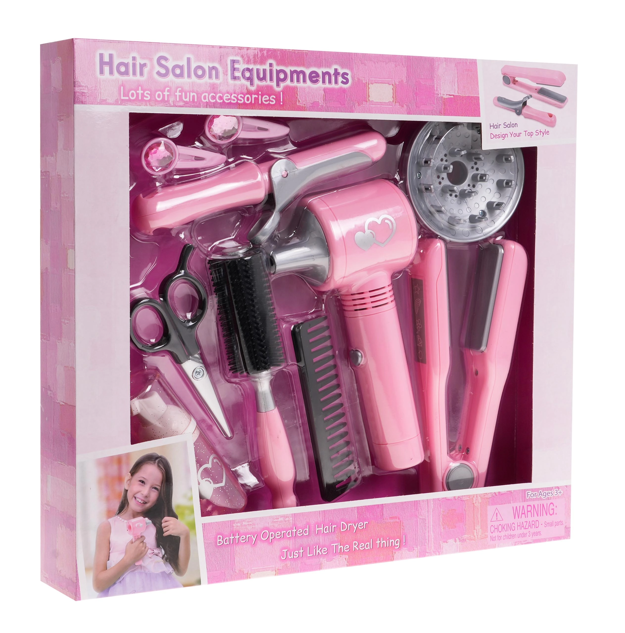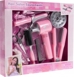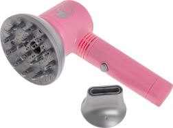 De kinderset kappersbenodigdheden bevat alles wat een kleine kapper nodig heeft voor haar eerste pogingen tot haarstyling. De föhn werkt op batterijen en biedt een zachte luchtstroom, die het echte föhnen van haar getrouw simuleert. Hij heeft ook twee verwisselbare opzetstukken - diffuser en concentrator.