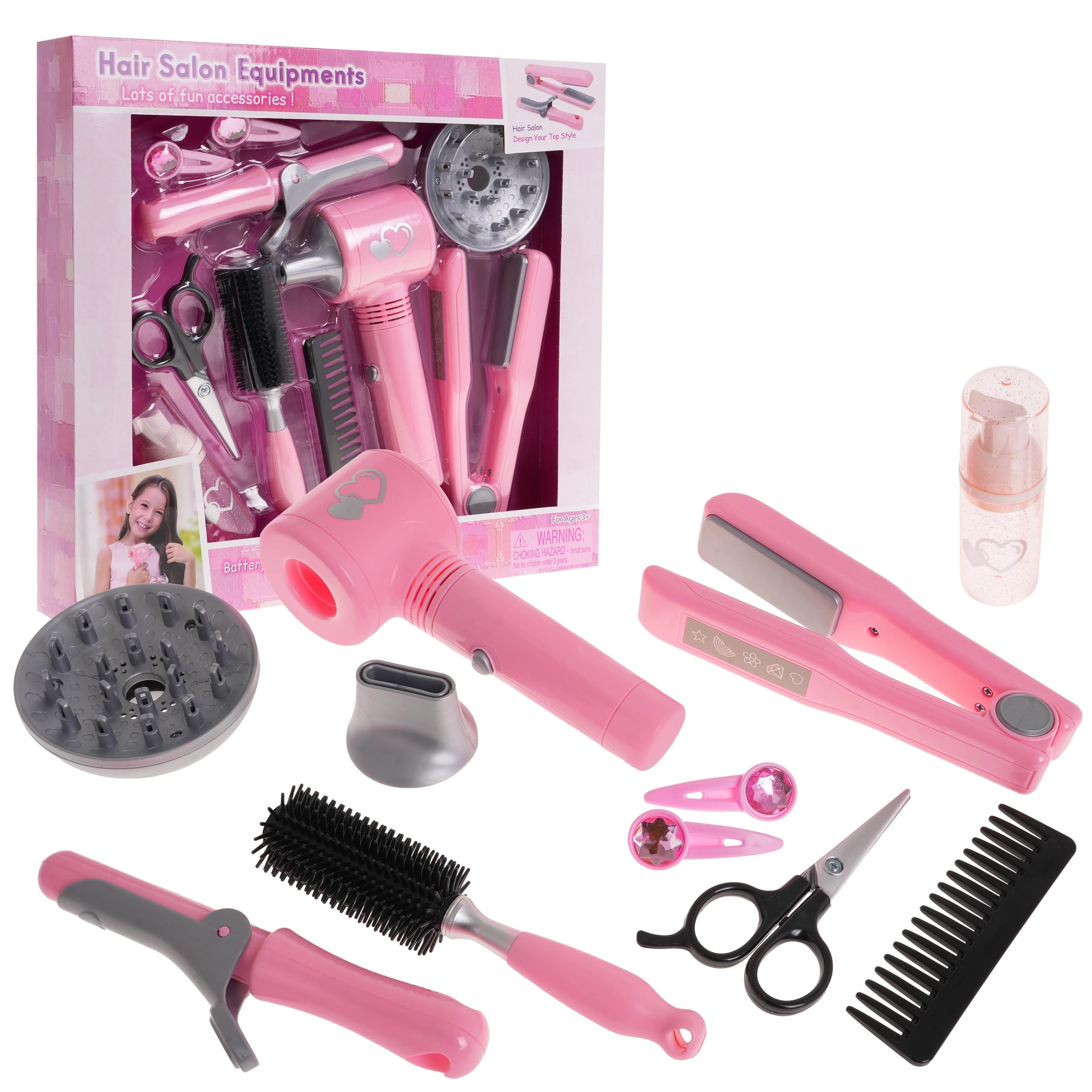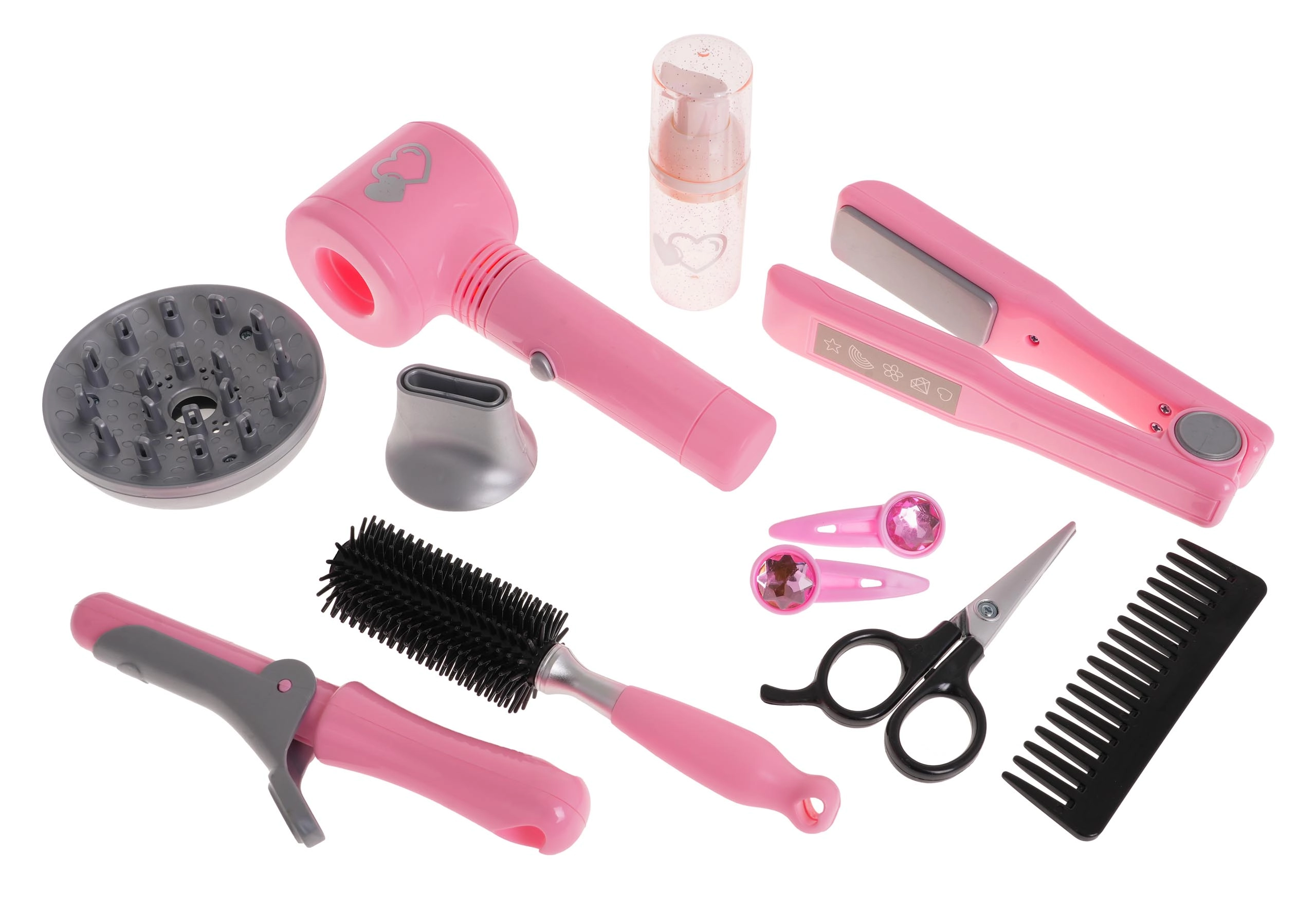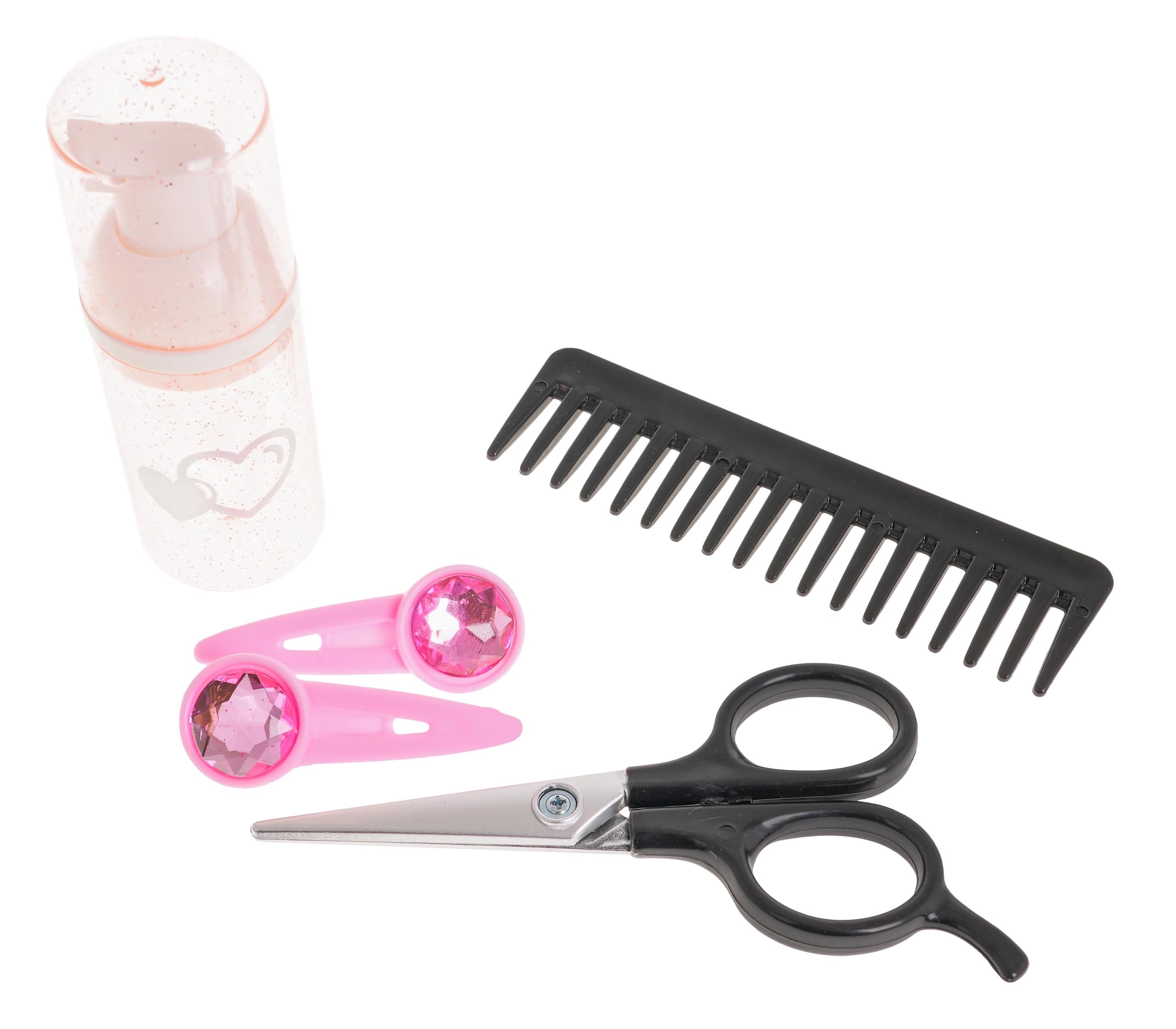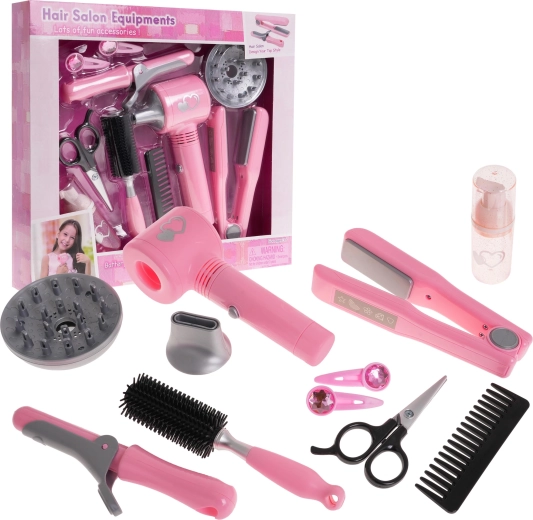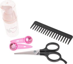 De set bevat ook een krultang en stijltang, kam, borstel, schaar, flesje en haarklemmen, wat alles biedt voor creatief spel.
