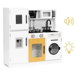 Deze stijlvolle kinderkeuken in wit-hout design bootst een echte keuken natuurgetrouw na. Dankzij de oplichtende kookplaten en kookgeluiden na het indrukken van de rode knoppen wordt spelen nog aantrekkelijker. Openende deurtjes van koelkast, oven, magnetron en wasmachine, draaiknoppen van het fornuis en een “waterdispenser” met borrelend geluid ondersteunen realistische speelscenario’s.