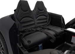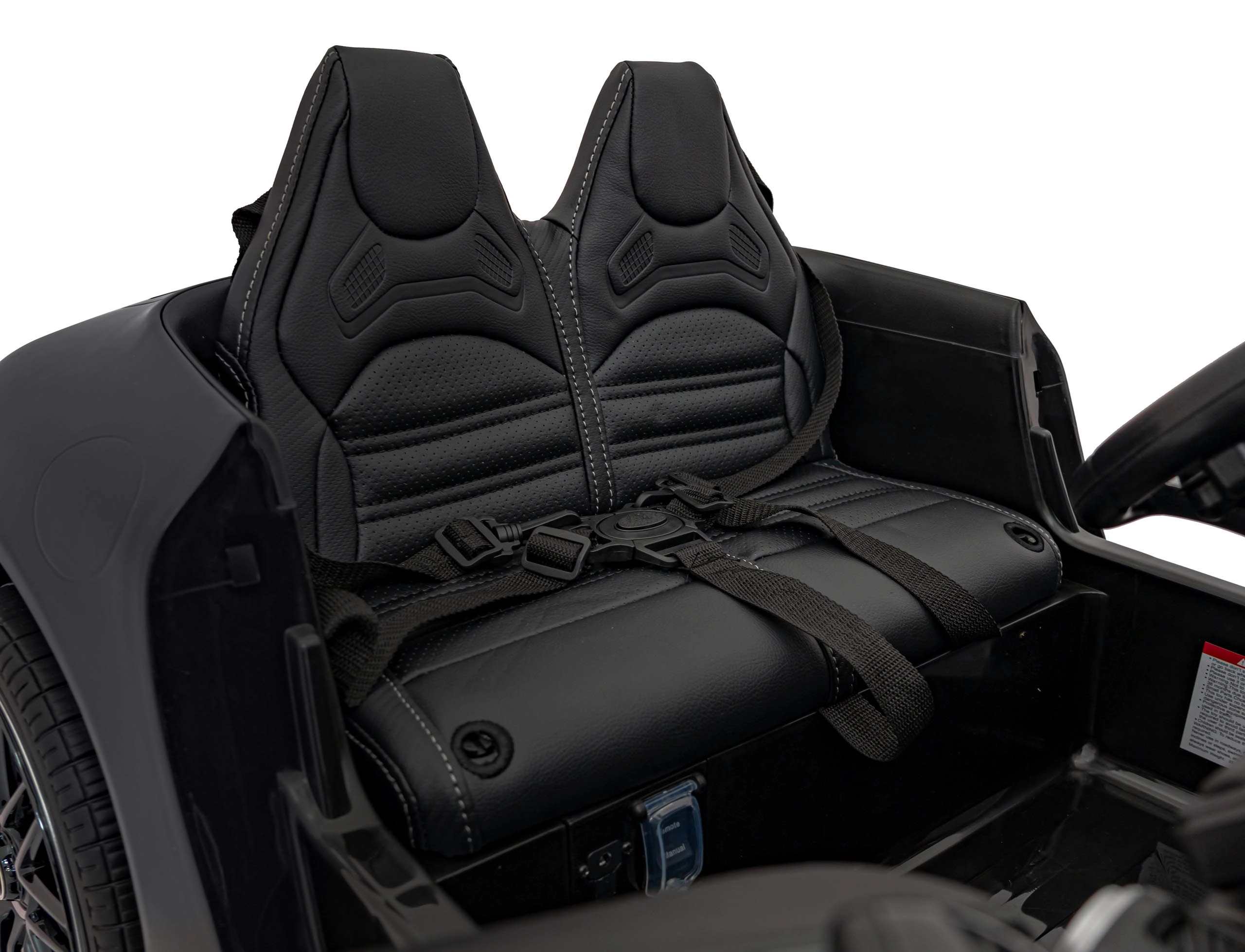 Zachte EVA‑wielen, een eco‑lederen stoel met gordels en LED‑lichten voor en achter zorgen voor een authentieke rijbeleving.