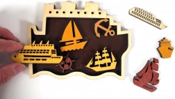 Leg de gekleurde houten stukjes in de vorm van schepen, een anker of een roer in de precies afgebakende ruimte. Geweldig voor het trainen van logica en fijne motoriek.