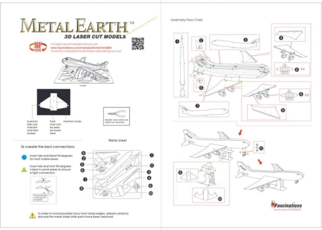 Haal de afzonderlijke onderdelen uit de metalen plaatjes; gebruik indien nodig een kleine zijkniptang (niet inbegrepen). De onderdelen worden met elkaar verbonden via vergrendelingen die bestaan uit een lipje en een opening. Buig het lipje met een kleine punttang (niet inbegrepen) en verbind stap voor stap alle vergrendelingen tot er een zeer realistisch meesterwerk ontstaat!