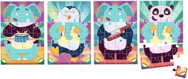 De Ravensburger Mix & Match-set combineert klassiek puzzelplezier met de creatieve mogelijkheid om stukjes onderling te verwisselen. Kinderen kunnen volgens voorbeeld leggen, of stukjes tussen alle drie de puzzels combineren en zo nieuwe, grappige wezens maken.