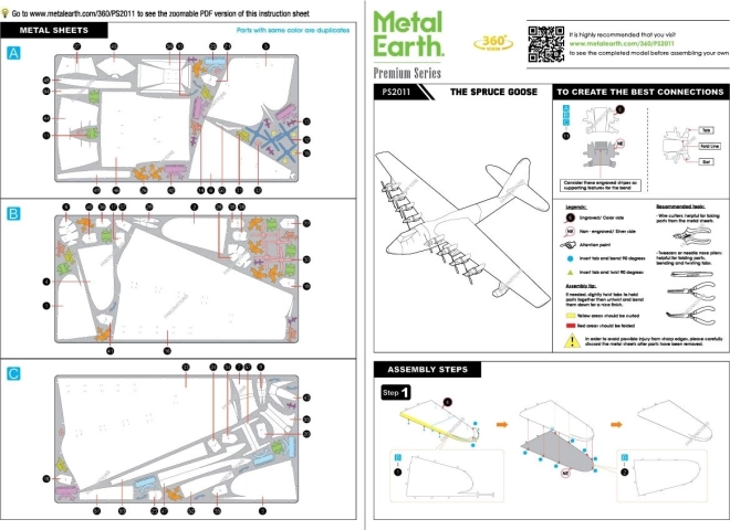 De montage gebeurt zonder lijm – onderdelen worden verbonden met vergrendelingen en omgebogen lipjes. Voor comfortabel bouwen raden we fijne tangen en een kleine zijsnijtang aan (niet inbegrepen). Na voltooiing krijg je een stabiel, metalen model met een indrukwekkende spanwijdte dat elk interieur verfraait.