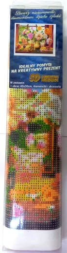 Diamantschilderen - werkwijze: De bovenkant van het canvas is voorzien van lijm en bedekt met een transparante folie. Verwijder de folie geleidelijk per gedeelte, naarmate je de steentjes aanbrengt. Het canvas bevat symbolen volgens de legenda, die verwijzen naar de gekleurde zakjes met steentjes. Neem was in de pen en breng de steentjes aan op de overeenkomstige plaatsen.