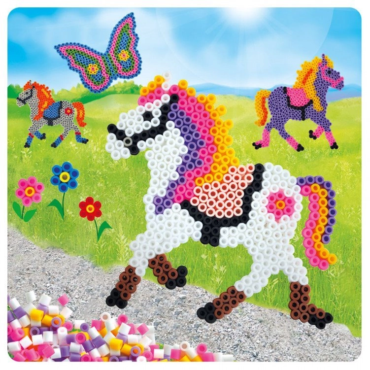 Je kunt je eigen variaties van magische afbeeldingen maken. Leg kleurrijke plaatjes van hondjes of bloemetjes. Je kunt afbeeldingen leggen volgens het voorbeeld of je eigen creaties verzinnen. Werkwijze: Leg de gekleurde kralen op het meegeleverde kunststof pegboard. Zodra alle kralen op hun plek liggen, vraag je mama of papa om te helpen en kunnen jullie samen het plaatje fixeren. Leg bakpapier op de kralen en strijk met een op de hoogste stand verwarmd strijkijzer over het papier totdat de kralen aan elkaar smelten. Zodra alles is afgekoeld, kun je het figuur voorzichtig van de mal halen (buig het plaatje niet) en klaar! Je hoeft de kralen niet alleen te strijken; je kunt ze ook rijgen en er versieringen en originele sieraden van maken. Inhoud verpakking: - 2000 strijkkralen - 4 kunststof pegboards - 1 vel met voorbeelden - 1 vel strijkpapier Geschikt voor kinderen vanaf 5 jaar. Aanbevolen onder toezicht van een volwassene.