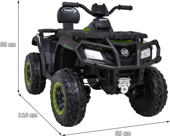 De kinder elektrische quad XT-Speed 4x4 biedt enthousiasme en plezier dankzij de krachtige 4x4-aandrijving en het realistische ontwerp. Met hoogwaardige EVA-schuimbanden met een diameter van 33 cm en een breedte van 11 cm zorgt hij voor ideale stabiliteit en perfecte tractie voor veilige outdoor-avonturen.