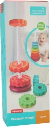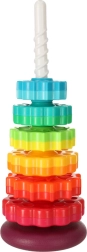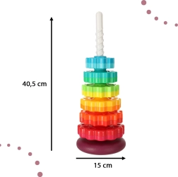 Deze kleurrijke spiraaltoren verenigt beweging, kleuren en texturen in één speels geheel. Kinderen plaatsen getande ringen op de kunststof spiraalstaaf, volgen hun rotatie en horen de subtiele geluiden tijdens het naar beneden glijden. Het spel stimuleert de oog–handcoördinatie, oorzaak–gevolg en het sorteren op grootte en kleur.