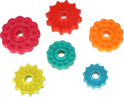 Ringen met een getande rand glijden langs de gedraaide staaf, draaien daarbij rond en zorgen voor een boeiend visueel effect en subtiele geluiden. Kinderen oefenen spelenderwijs hun oog–handcoördinatie en begrijpen het principe van oorzaak–gevolg.