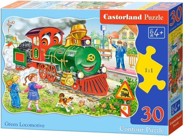 Kleurige kinderpuzzel met een groene locomotief, bevat 30 stukjes en vormt na het leggen een afbeelding van 32 × 23 cm. Ideaal voor de eerste puzzelervaring, met hoogwaardige afwerking en aantrekkelijke kleuren die concentratie, geduld en verbeeldingskracht stimuleren.