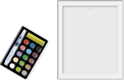 De set bevat: 2 afbeeldingen, een palet met verfjes, een navulbare penseel en een lijst.