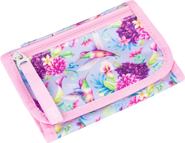 De portemonnee heeft een prachtig patroon van bloemen en kolibries, dat de aandacht trekt en stijl toevoegt aan elke outfit.