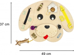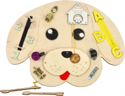 Een speels houten activiteitenbord in de vorm van een hond stimuleert bij kinderen de fijne motoriek, logica en concentratie. Bevat gekleurde houten cijfers en letters, een rits, gespen en schuifjes, een belletje en andere interactieve elementen die spelenderwijs leren en de zintuiglijke ontwikkeling ondersteunen.