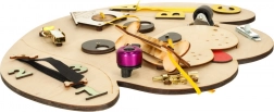Dit schattige activiteitenbord in de vorm van een hondenkop is ontworpen voor veilig ontdekken en dagelijks vaardigheidstraining. Kinderen oefenen hun greep, oog–handcoördinatie en geduld bij het hanteren van verschillende sluitingen, een rits of een belletje. De gekleurde letters en cijfers ondersteunen bovendien op natuurlijke wijze de eerste kennismaking met het alfabet en met tellen.