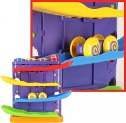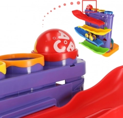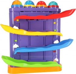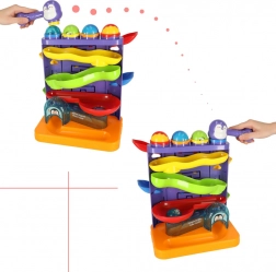 Een leuke en kleurrijke 3-in-1 knikkerbaan voor kinderen vanaf 3 jaar met twee aparte circuits – één voor knikkers en één voor het autootje. Met het hamertje slaan kinderen de knikkers door de bovenste openingen en volgen ze hun rit naar beneden. Het spel stimuleert fijne motoriek, oog-handcoördinatie en legt op een natuurlijke manier de principes van zwaartekracht uit. Inclusief 4× knikker, autootje en hamertje.