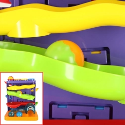 De baan heeft twee onafhankelijke circuits – één voor knikkers en één voor auto’s – zodat zowel één als meerdere kinderen tegelijk kunnen spelen. Het robuuste kunststof is gemakkelijk schoon te maken en klaar voor dagelijks gebruik.
