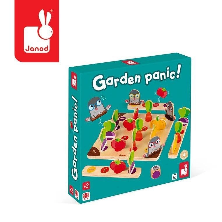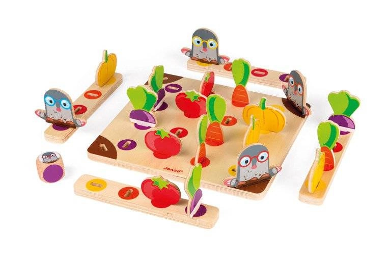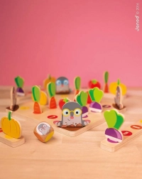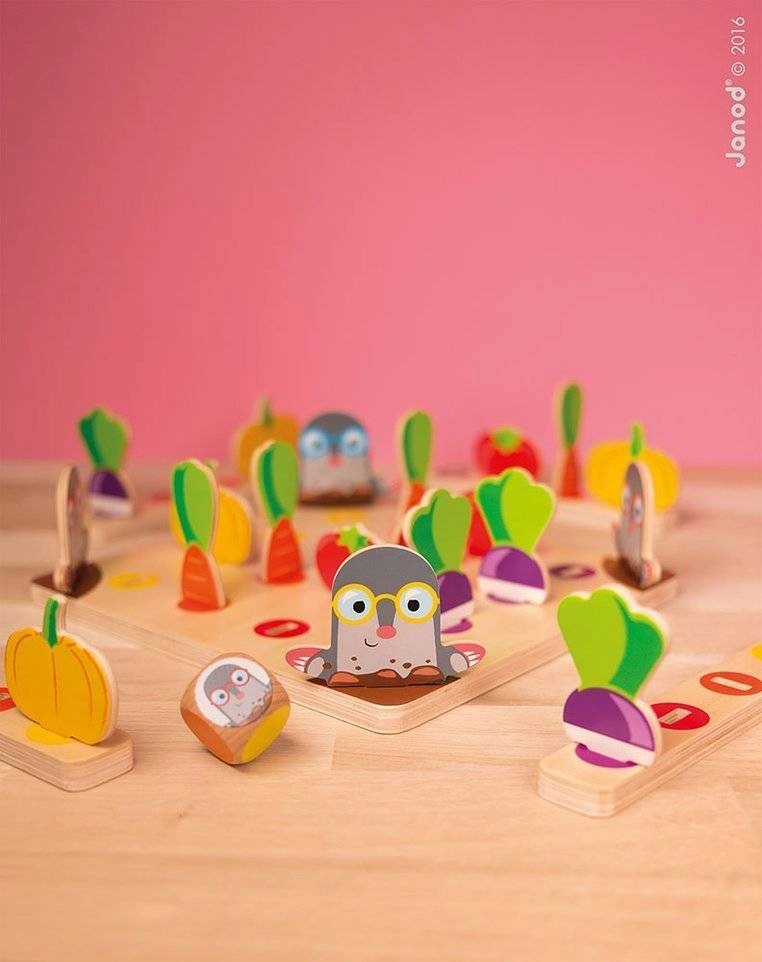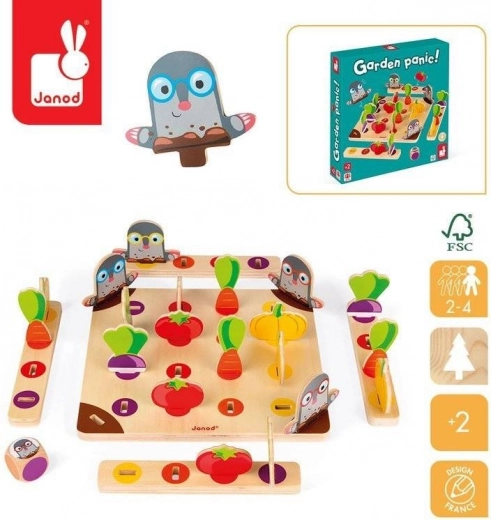 Een leuk houten familiespel voor 2–4 spelers van het merk JANOD, waarin je gewassen in je mand verzamelt en tegelijk mollen ontwijkt. Stimuleert snelheid, observatievermogen, geduld en kleurenherkenning. Hoogwaardige houten afwerking, prachtige illustraties en eenvoudige regels maken dit spel tot een ideaal cadeau voor kinderen en volwassenen.