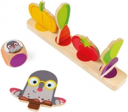 Een stabiel vierkant bord met “bedden” en fraai beschilderde houten groentestukjes nodigen uit tot spel en ontwikkelen de fijne motoriek en het herkennen van vormen en kleuren.