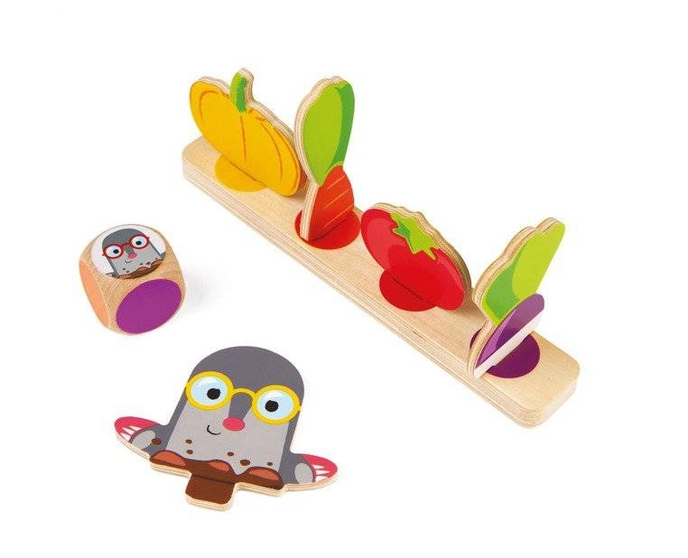 In dit houten gezelschapsspel kruipen spelers in de huid van tuiniers: op het speelbord groeien kleurrijke “bedden” met tomaten, wortels, pompoenen en bieten en in de hoeken loeren mollen. Je gooit met de dobbelsteen – de kleur bepaalt welk gewas je in je mand legt; een mol legt je oogst tijdelijk stil. Wie als eerste van elke soort één stuk verzamelt, wint.