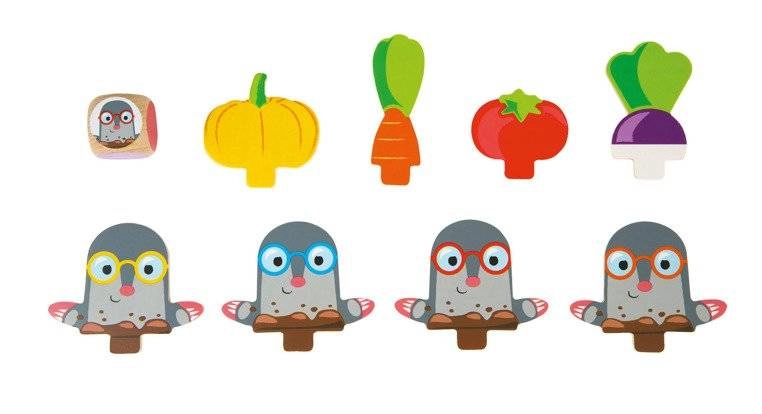 - 1 speelbord, 4 standaards/mandjes, 20 houten stukken (4 mollen, 16 groentes: tomaat, wortel, pompoen, biet), 1 dobbelsteen