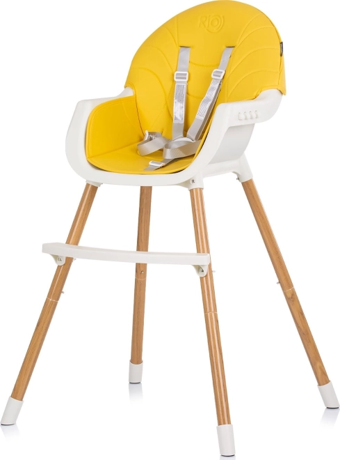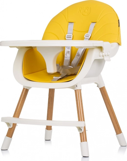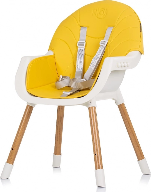 Praktische kinder eetstoel 2-in-1 CHIPOLINO Rio Mango combineert een hoge en lage variant in één. Biedt een comfortabele lederen zitting voor eenvoudig reinigen, 5-punts veiligheidsgordels, een schuifbaar dienblad met 3 standen en antislipvoetjes voor stabiliteit. Ideaal voor zelfstandig zittende kinderen tot 15 kg.