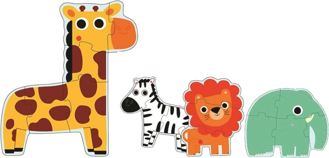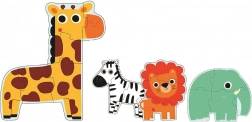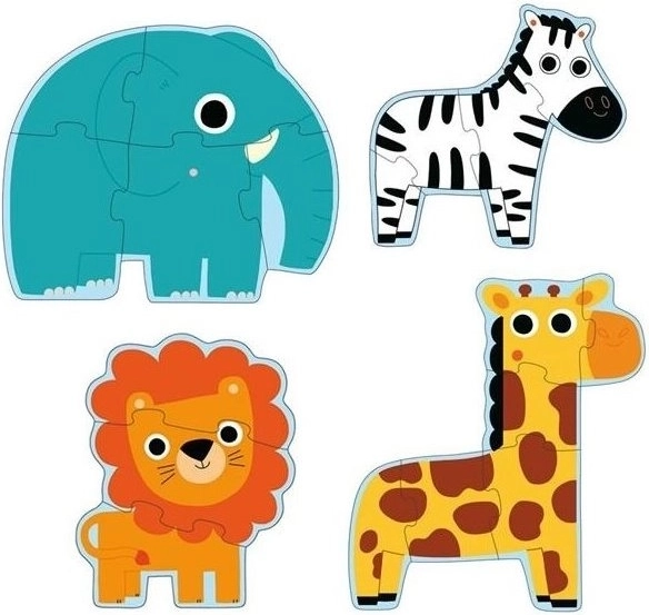 Ontdek leuke omlijnde puzzels met een leeuw, zebra, olifant en giraffe – ideaal voor de eerste puzzelervaring. De set bevat vier puzzels met oplopende moeilijkheid (3, 4, 5 en 6 stukjes) en stimuleert fijne motoriek, logisch denken en oog-handcoördinatie. Een geweldige keuze voor kinderen vanaf 2 jaar.