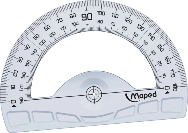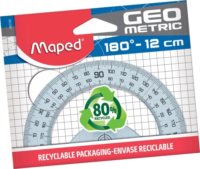 Praktische transparante gradenboog van het merk Maped met een lengte van 12 cm, ideaal voor wiskunde- en geometrie-lessen. Biedt nauwkeurige hoekmeting, helder materiaal voor betere leesbaarheid en een compact formaat voor in de etui.