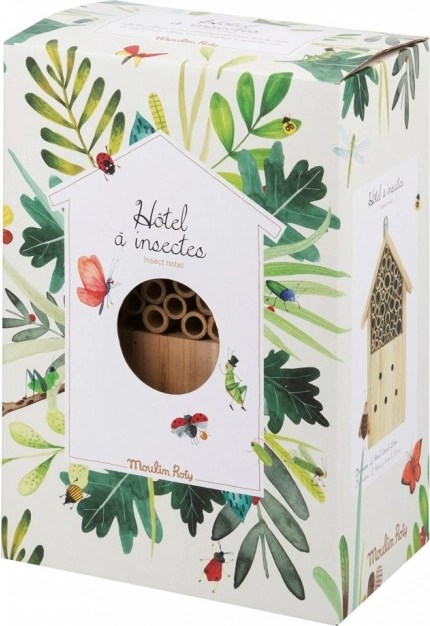Het insectenhotel van Moulin Roty is een prachtig houten huisje dat verschillende soorten insecten aantrekt, waardoor je ze kunt observeren en bestuderen. Perfect om de nieuwsgierigheid van kinderen en hun band met de natuur te stimuleren. Dit hotel: