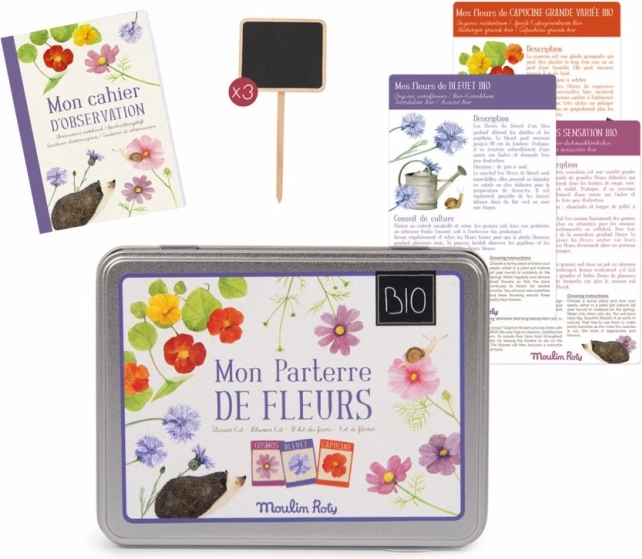 Prachtige bloemzadenset van Moulin Roty waarmee je bloemen zoals Oost-Indische kers, cosmos en korenbloemen kunt kweken. Ideaal voor alle tuinliefhebbers.