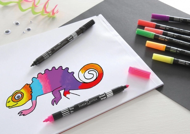 De set bevat 10 hoogwaardige dubbelzijdige stiften Faber-Castell Neon met verschillende puntbreedtes, ideaal voor diverse tekentechnieken.