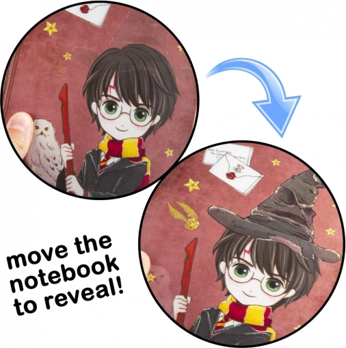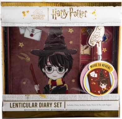 Verruk kleine én grote HARRY POTTER-fans met een stijlvolle schrijverset die elke notitie in een magische belevenis verandert. De lenticulaire omslag van het dagboek verandert het beeld naargelang de kijkhoek, zodat je er steeds met plezier naar kijkt. Praktische extra’s zoals themastickers, memoblaadjes en de pen met Hedwig zullen iedere liefhebber van de toverwereld blij maken.