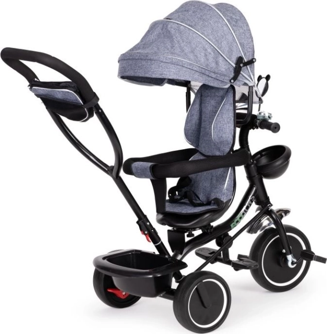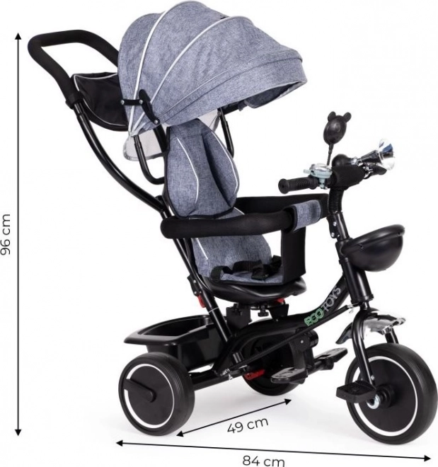 De driewieler van ECOTOYS zorgt voor comfort dankzij de zachte rugleuning en veiligheidsriemen. De afneembare kap beschermt tegen zon en regen.